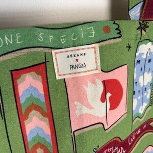 Limited-edition Sézane x Pangea canvas tote featuring the Drapeau fond vert (green flag) print with colorful flags, doves, stars, and “One Species” slogan artwork all over. Crafted from recycled cotton, it has a spacious rectangular body with a boxed bottom, long shoulder straps, and is fully printed inside and out—perfect for everyday errands, work, school, or as a weekender/market bag. This collaboration collection sold out quickly on Sézane’s site and this exact tote is no longer available to purchase new, making it a rare find for collectors of Sézane accessories and fans of this eco-conscious capsule. Gently used and in great condition with vibrant colors and no major flaws; see photos for details.