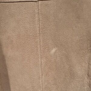 Stay warm and stylish with this elegant suede tan coat featuring luxurious faux fur trim and lining. Slight discolored spot on back - looks like nap of the suede. Brand and size unknown but fits like a large.