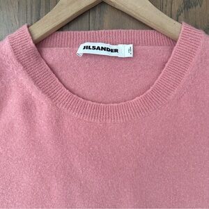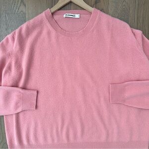 Jil Sander cashmere crew neck sweater. In light pink. A crew neck sweater with ribbed trim at neck, cuffs, and waist. Oversize fit. A gorgeous quiet luxury designer piece. Made in Italy. Dry clean only. Can be worn casually or dressed up. Size 40, small, measures 24" armpit to armpit, 23.75" shoulder to hem, 19.25" shoulder to shoulder, 22.5" sleeve length. Pilling throughout with wear as pictured. In fair used condition. No trades; bundle discount available.
