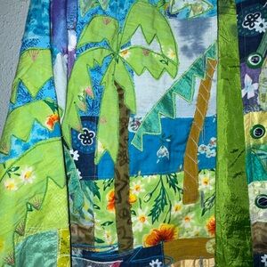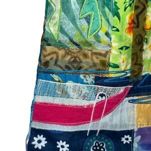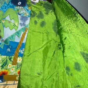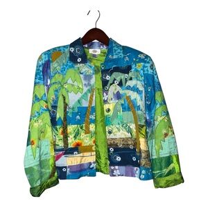 Fabulous vintage art piece! Unique and boho colorful. Gorgeous splotched lining. Gentle minimal padded shoulder. . Cotton , silk, rayon. Medium see measurements.