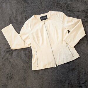 Lightweight cream jacket with zipper front and zip pockets. Tailored, fitted, and unlined, this is a great layering piece.