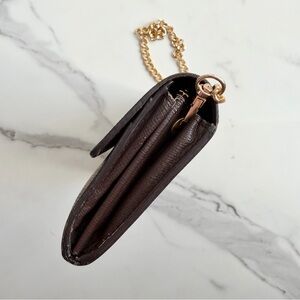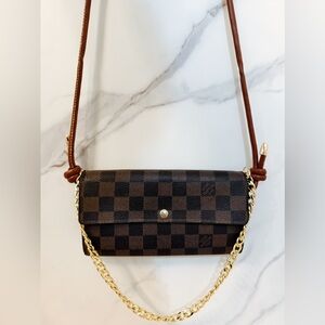 Authentic Louis Vuitton Damier Ebene Wallet reworked for versatile crossbody wear with an unbranded, adjustable strap and metal grommets. Chain and Strap can be easily removed to carry as a wallet.