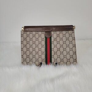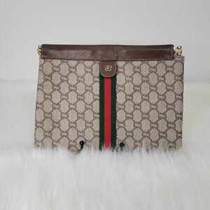 GUCCI PLUS VINTAGE CLUTCH Iconic Gucci Canvas Brown/Tan w Red/Green Stripe