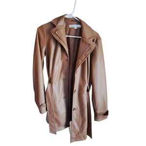 Chic brown faux leather jacket. Features a classic lapel and sleek design. Pit to Pit approx 13". Shoulder to hem approx 32".