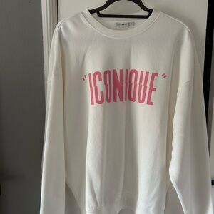Clare V sweatshirt in white w/pink 'Iconique' design. Perfect for casual wear. Soft and cozy. In excellent new condition.