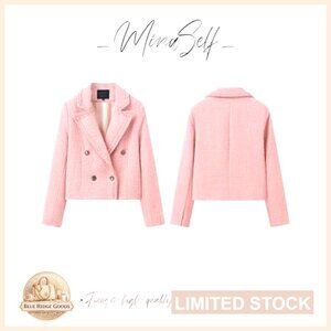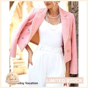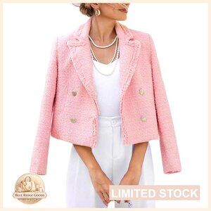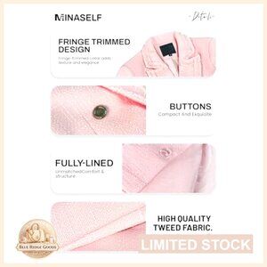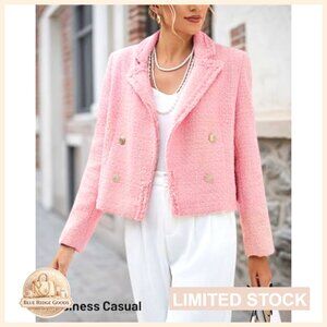 Tweed Blazer Jacket Elegant Cropped Fringe Trim Business Casual Fully Lined