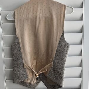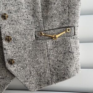 Stylish vest. Features tweed fabric with silk lining. Gold metal detail on pocket. Perfect for layering.