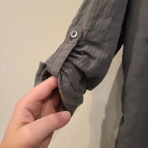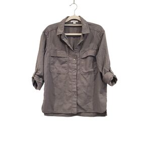 Gray cotton button up with cargo style pockets on front. Light stretch. Size 2 = medium. In excellent preloved condition