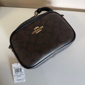 Elegant Coach crossbody with signature pattern. Black leather trim and brown canvas. Ideal for daily use. Bottom long 19cm