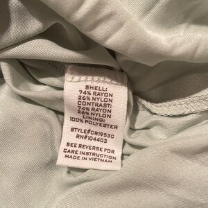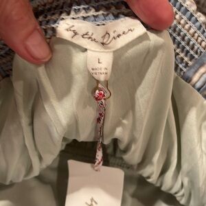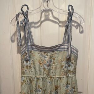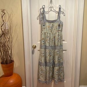 Sage blue tan white dress. Beautiful. Has the elastic ruffle in the back top lined