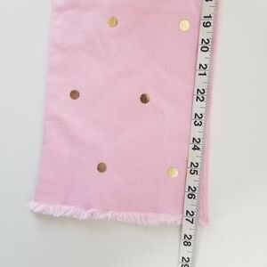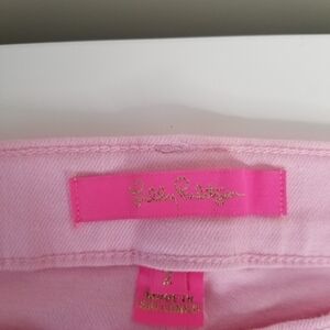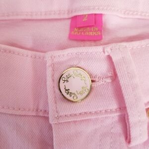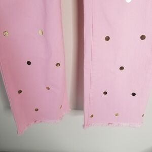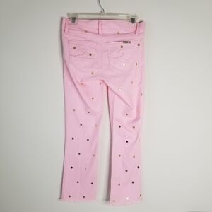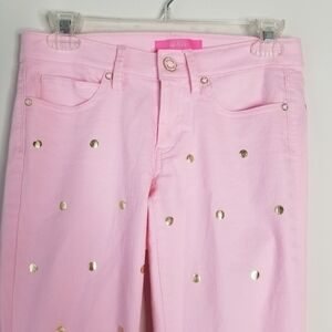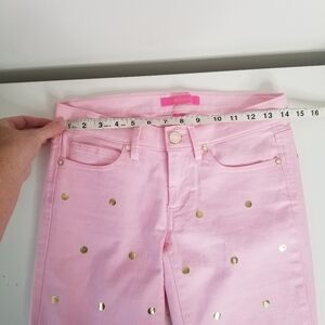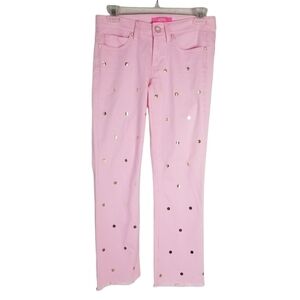 Gently used Lilly Pulitzer South Ocean Crop Flare Denim Jeans in a size 2. Color is light pink with gold metallic polka dots all over.