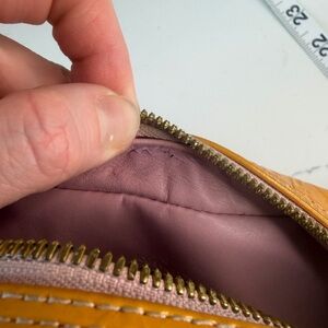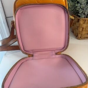 Authentic Vintage Louis Vuitton Vernis Wooster, date code 1999. Yellow/orange exterior is nice with small spots normal for age. Zippers work well, zipper fabric has a little stain (cleanable). Marshmallow pink Interior is clean, tiny peeling by zipper area (normal for age). Straps have watermarks, strong with nice honey patina. Crossbody or shoulder bag. Overall nice preloved LV.