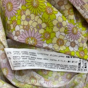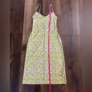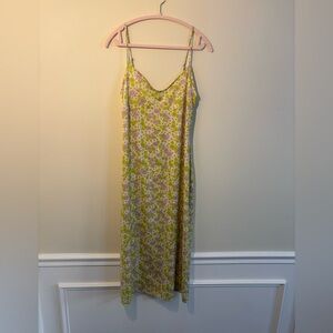 Zara Satin Effect Floral Midi Dress with a vibrant yellow-green and purple micro-floral pattern. This 90s-inspired slip dress features delicate spaghetti straps, a V-neckline, and a distinctive open back with a cut-out detail.