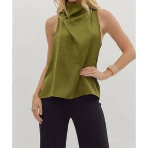 NEW ENTRO sleeveless satin mock neck top in olive
