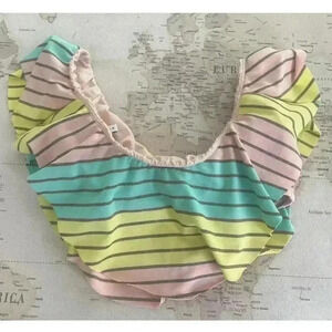 Peachy pink, turquoise, yellow and metallic striped ruffled bandeau off shoulder swim -bikini top, that could be worn as a tank as well. Very nice condition with no flaws to note.