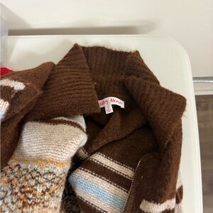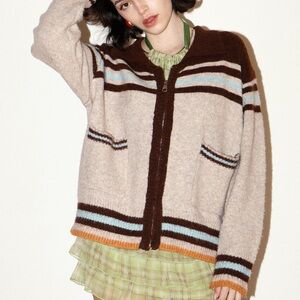 Cozy up in this stylish brown and cream cardigan sweater, perfect for any casual outing. The unique design adds a touch of personality to your wardrobe.