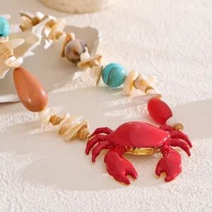 Vibrant red crab pendant. Accented with turquoise and earthy beads. Perfect for ocean lovers.