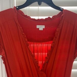 Stylish deep orange jumpsuit by LOFT. Features a flattering V-neck and short sleeves. Ideal for versatile wear.