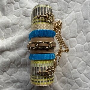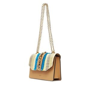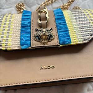 Elegant Aldo crossbody with beige and blue accents. Features a bold chain detail and animal emblem. Ideal for a stylish look.