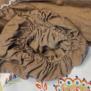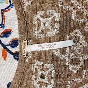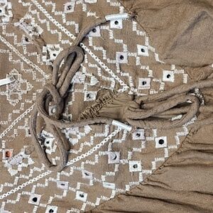 Pretty tan tone Free People xs pink and white embroided crop style top. It measures 22" pit to pit and 15" shoulder to hem. I think it's made oversized even though it's xs and can work for s-m and possibly large as well.It's made in a "puffy" way on arm and waist bands!