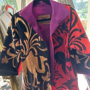 Vibrant blazer with intricate gold patterns. Features bold black and red sections. Unique and eye-catching design. Designed and painted by artist Starr Hagennbring
