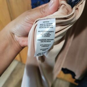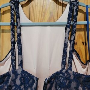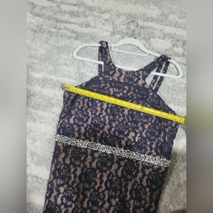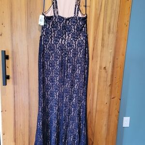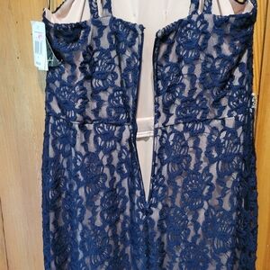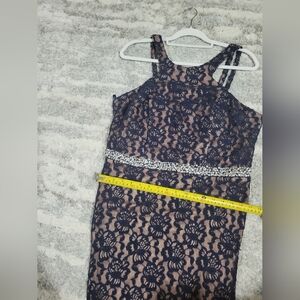 Stunning navy lace gown featuring a rhinestone waist detail. Perfect for formal occasions.