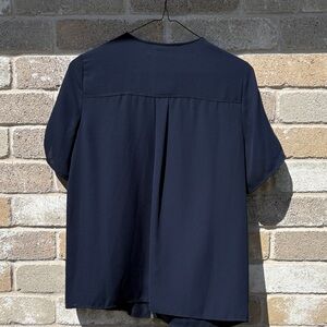 Chic navy blouse with a front gold zipper. Features stylish sleeve accents.