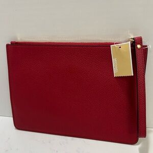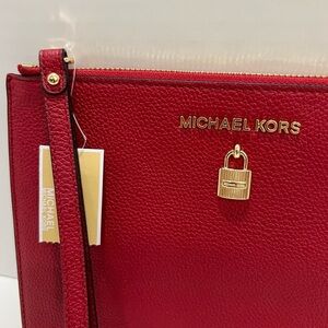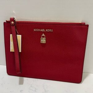 Stylish red wristlet by Michael Kors. Features a sleek design with a lock detail.