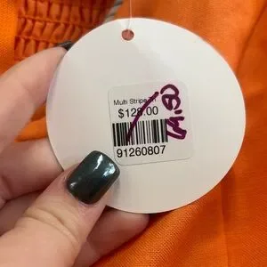 Orange dress with green and white stripes. Features a stylish design.