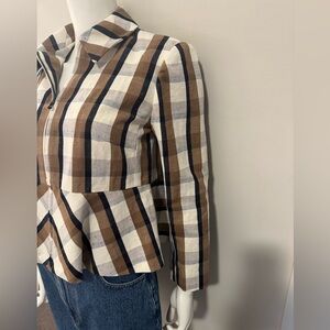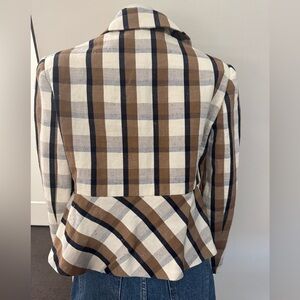 Sweet cotton/linen jacket in a brown and black plaid. Seaming detailing and a peplum bottom. Zip up closure. Textured fabric. New condition.