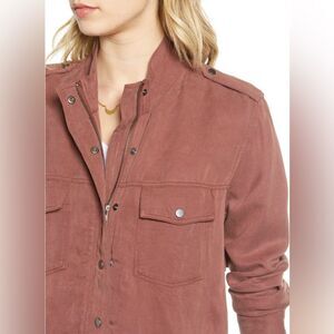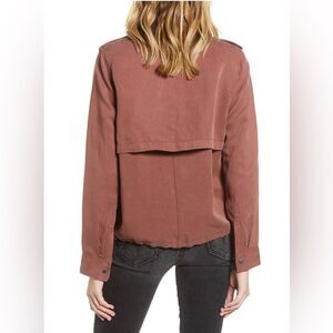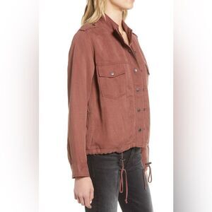 Rails Collins Military Jacket in Burgundy is a chic and versatile outerwear piece that combines utilitarian style with a modern twist. Crafted from lightweight fabric, this jacket features a structured silhouette with classic military-inspired details such as shoulder epaulettes, flap pockets, and a drawstring waist for a customized fit. The rich burgundy color adds a bold, sophisticated edge, making it perfect for layering over casual or dressy outfits. Whether worn open for a relaxed look or cinched at the waist for a more defined shape, this jacket is a standout addition to any wardrobe. Size Small