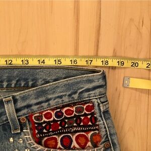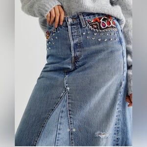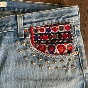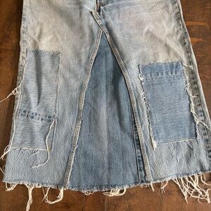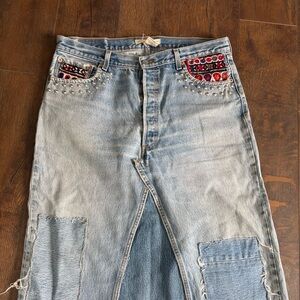 This skirt is A-MAZING and I would never sell it, if it still fit me. The added details, metal stud work, fabric patches, and raw hem distressing make this so unique and boho chic. It’s 100% cotton so no stretch and fits pretty true to size. I was a 32 when I bought it and it fit, but slightly snug. I only ever wore this twice and washed it once.
