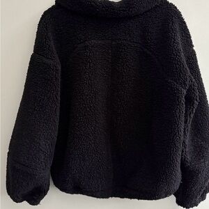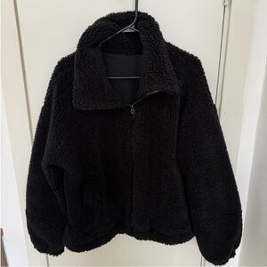 Stay warm with this cozy black oversized sherpa jacket. Perfect for chilly days.