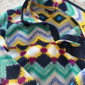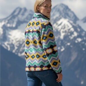 Warm fleece featuring a vibrant geometric design. Includes shades of blue, yellow, and purple. Perfect for outdoor adventures.