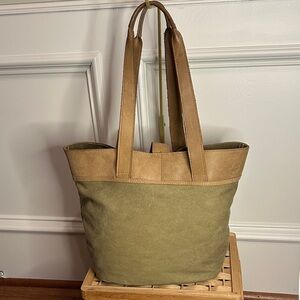 Vintage L.L. Bean open-top canvas tote bag in a classic two-tone neutral colorway (Tan/Khaki and Olive/Dark Green). Features heavy-duty cotton canvas and nubuck leather handles. Sophisticated commuter tote with tan and olive design. Ideal for daily essentials. Has pockets for cards, keys, water bottle and more. Will fit a laptop and other items. Durable and stylish.