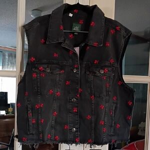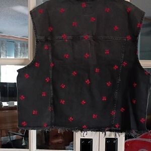 Stylish black jean jacket. Features red floral embroidery. Sleeveless design. Perfect for layering.
