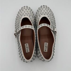 Alaïa Mary Jane flats crafted in soft cream leather and fully embellished with signature dome-set crystal studs. Featuring a classic rounded toe and an adjustable strap.