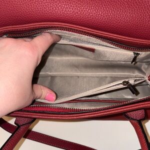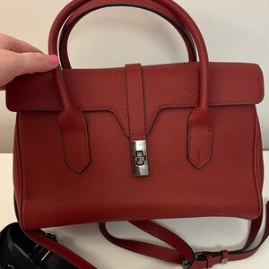 Elevate your style with this chic red satchel bag. Its bold color and sleek design make it a must-have accessory. Perfect for any occasion.