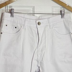 The product is a pair of men's distressed white skinny jeans in size 32x28. These jeans feature a regular fit and a 28-inch inseam, making them a stylish and comfortable option for everyday wear. The distressed detailing adds a unique and trendy element to the classic white color, making them a versatile addition to any man's wardrobe.