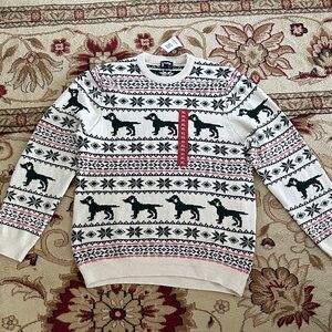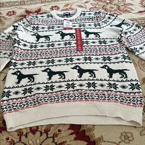 Cream sweater with green dogs and almost a fair isle pattern. A not so ugly ugly Christmas sweater.