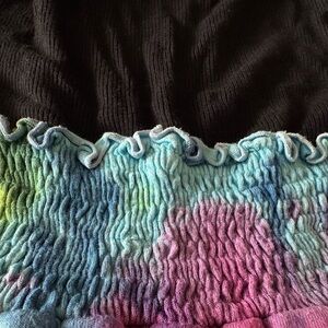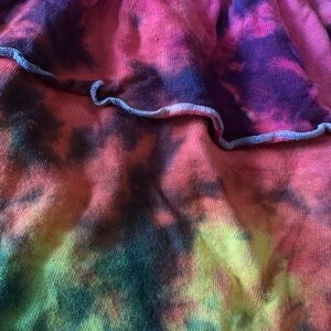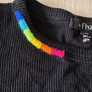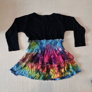 Stylish long sleeve dress. Features a colorful rainbow tie-dye skirt & black ribbed top with color detail on collar.