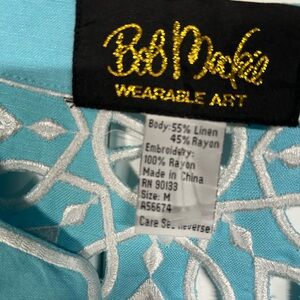 Bob Mackie Wearable Art embroidered cutout open-front jacket. This specific design features a turquoise or aqua linen blend with intricate white floral and geometric embroidery, along with distinctive eyelet cutout detailing on the front, sleeves, and hem.