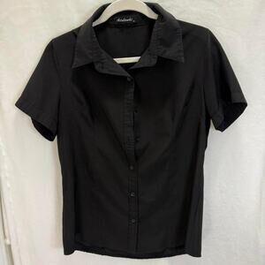 Black fitted short-sleeve button-down blouse (size Medium).