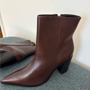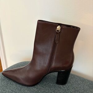 Chic dark brown leather ankle boots. Sleek design with a high block heel. Don’t fit my feet but brand new with the Schutz dust bag