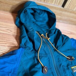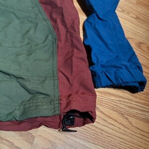 Colorful windbreaker with hood. Features blue, green, and maroon panels. Ideal for outdoor adventures.