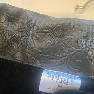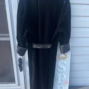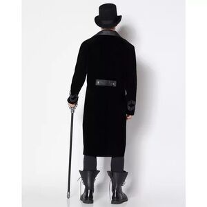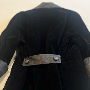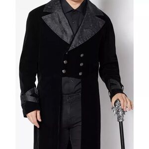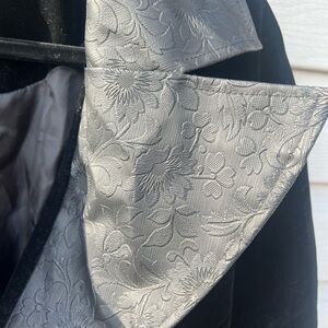 Design: coat black velveteen and features large, silver-toned pointed lapels with a subtle floral/brocade pattern