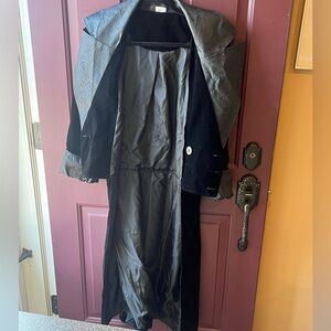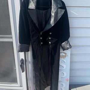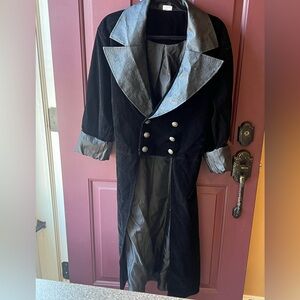 Key Features: double-breasted front with decorative silver metal buttons and a long swallowtail-style back, crewneck, cuffed sleeves & button closure
