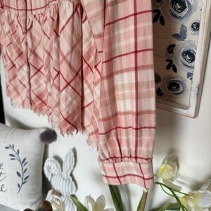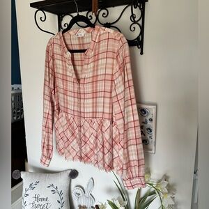 Adorable plaid button-up peplum top. Featuring a blend of pink and cream hues and a frayed hem giving it a boho feel. Soft, lightweight, and comfy!! So cute 🥰 Gently loved condition