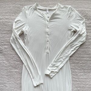 Give your sleep dress a sexy update with this long sleeve henley style. Made from SKIMS signature ultra soft, stretchy fabric that is incredibly form fitting and hugs all the right places. The material is extremely soft and comfortable while still contouring your shape beautifully. Features a flattering scoop neckline, classic button details, and a full length silhouette. Fits true to size. Stretchy, comfy, and so flattering on.