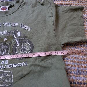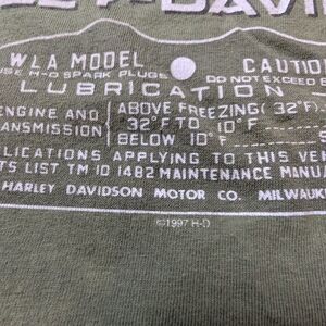 Authentic 1997 Harley-Davidson graphic tee in an olive green tone featuring the WLA-45 military motorcycle design on the front with “The Bike That Won The War.” Back graphic reads Pearl Harbor Harley-Davidson Motorcycles Honolulu, Hawaii.